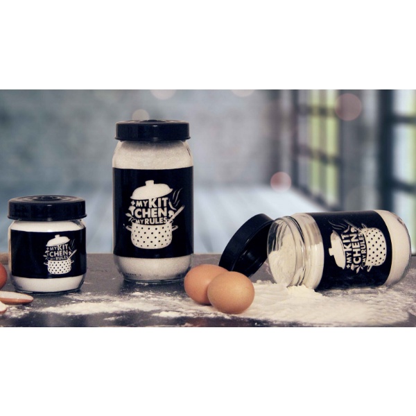 Върху стъкления буркан има стилна черна илюстрация и закачлив надпис My Kitchen, My rules ( Моята кухня, моите правила)