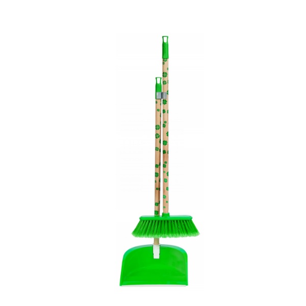 В основата си е изработен от качествена и устойчива пластмаса, а дръжките на метлата и лопатката са от преработена суха дървесина.