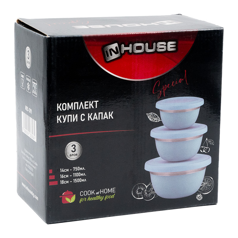 Комплектът съдържа 3 броя купички за съхранение с различни размери.