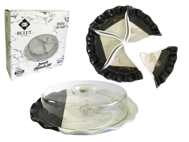 Ордьовър плато с капак и пет купички е комплект, изработен от керамика с подходяща дебелина.