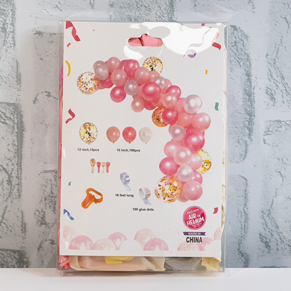 Състои се от 10 прозрачни балона с пайети и 100 броя цветни балони, с 2 броя тиксо и инструмент.